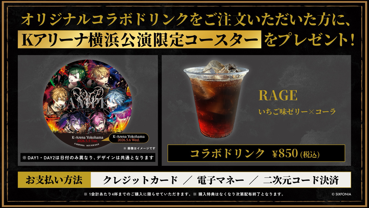 To commemorate the "SIXFONIA 2nd Live Tour -RAGE-" taking place from May 5th (Tue) to 6th (Wed), we have decided to sell a collaboration drink!