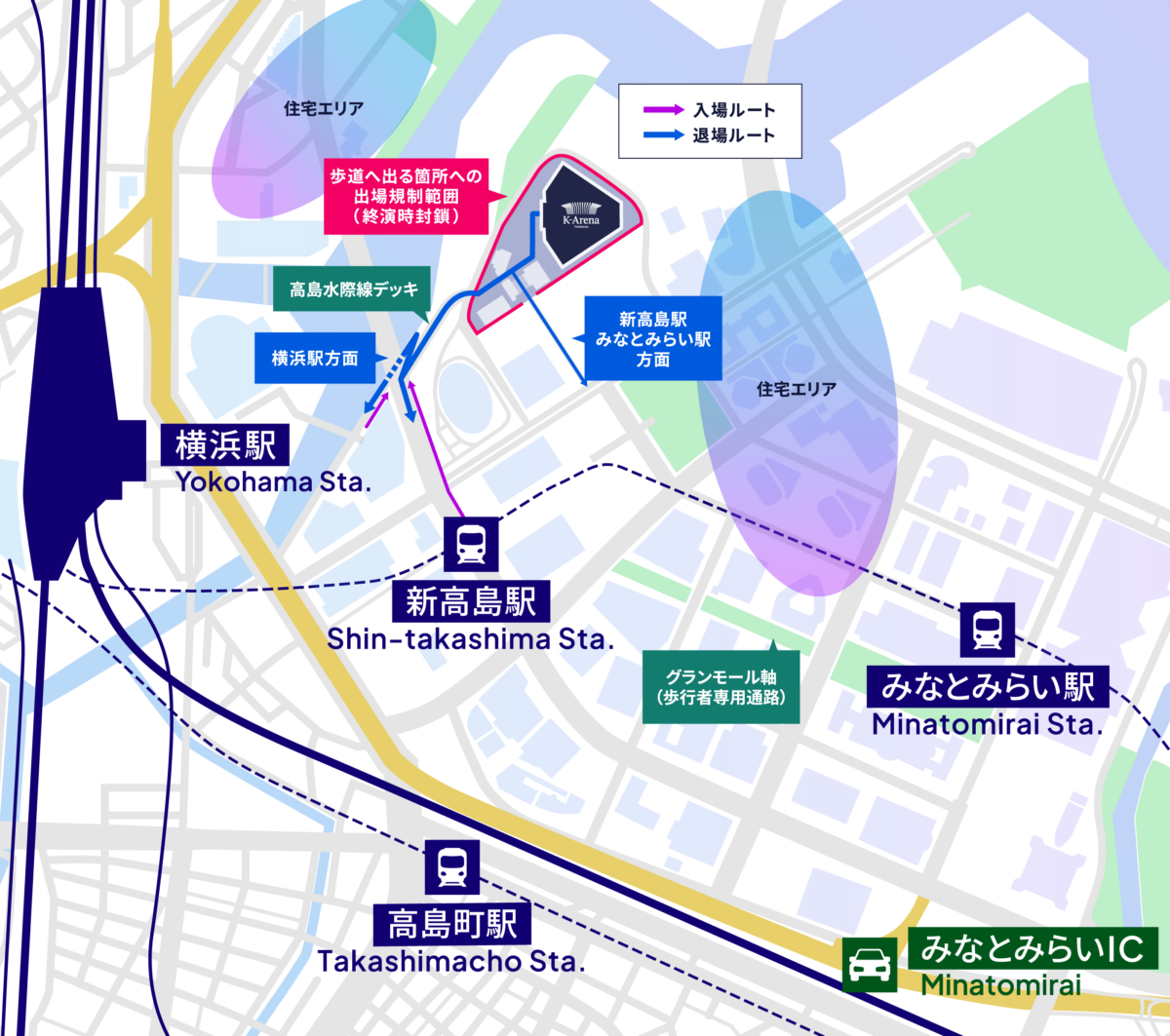 横浜駅とKアリーナ横浜間の徒歩ルートにつきまして、高島水際線デッキを利用する入退場ルートをご案内いたします。