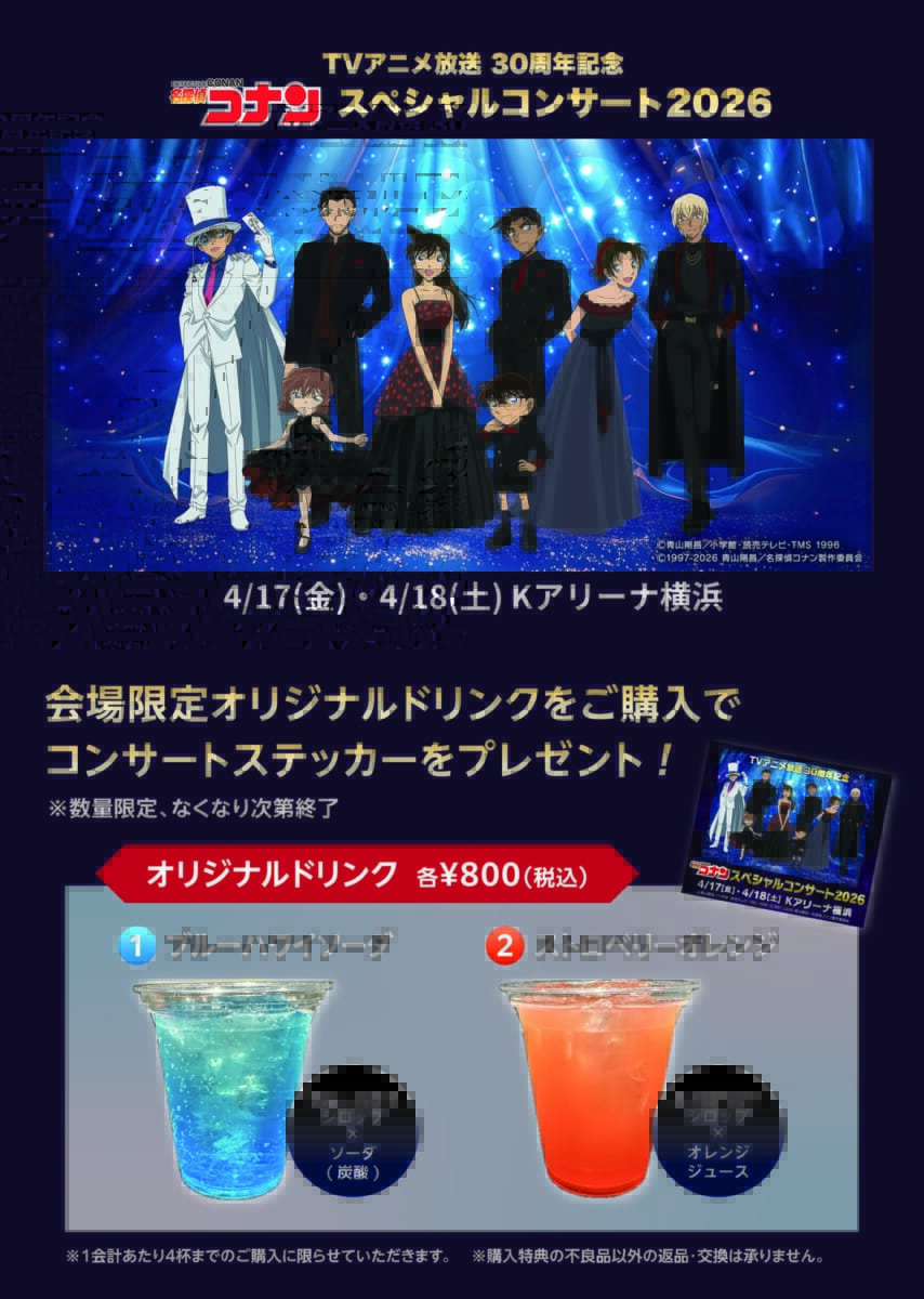 4/17(金)~18(土)に開催される「名探偵コナンスペシャルコンサート」公演にて、公演会場限定オリジナルソフトドリンクをご購入の方に、コンサートステッカー(全1種/両日共通デザイン)をプレゼントいたします!